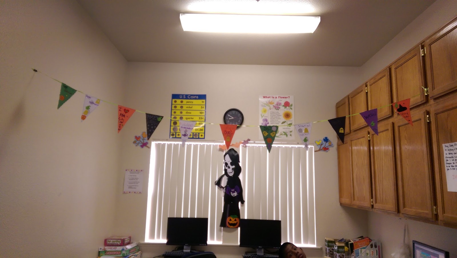 Since I was not counting on me being at the computer lab today or tomorrow, I really did not have anything planned but I came up with something fun and easy to finish sprucing up the classroom! (I was so exited I had to share right away!) Yesterday and today, the children and I have been working on making banners to make the room look even more festive! It is but the simplest of projects, only needing color construction paper and markers. I also had halloween stamps, stickers and foam stickers that I had left over from the last couple of projects so I let the children use those as well so they could make the pennants look as fun and decorative as possible.